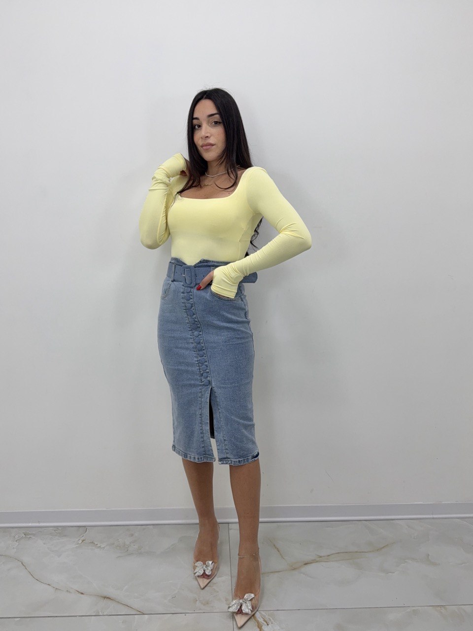 Longuette di Jeans maglia dalla Tg S alla Tg L. La ragazza in foto è...