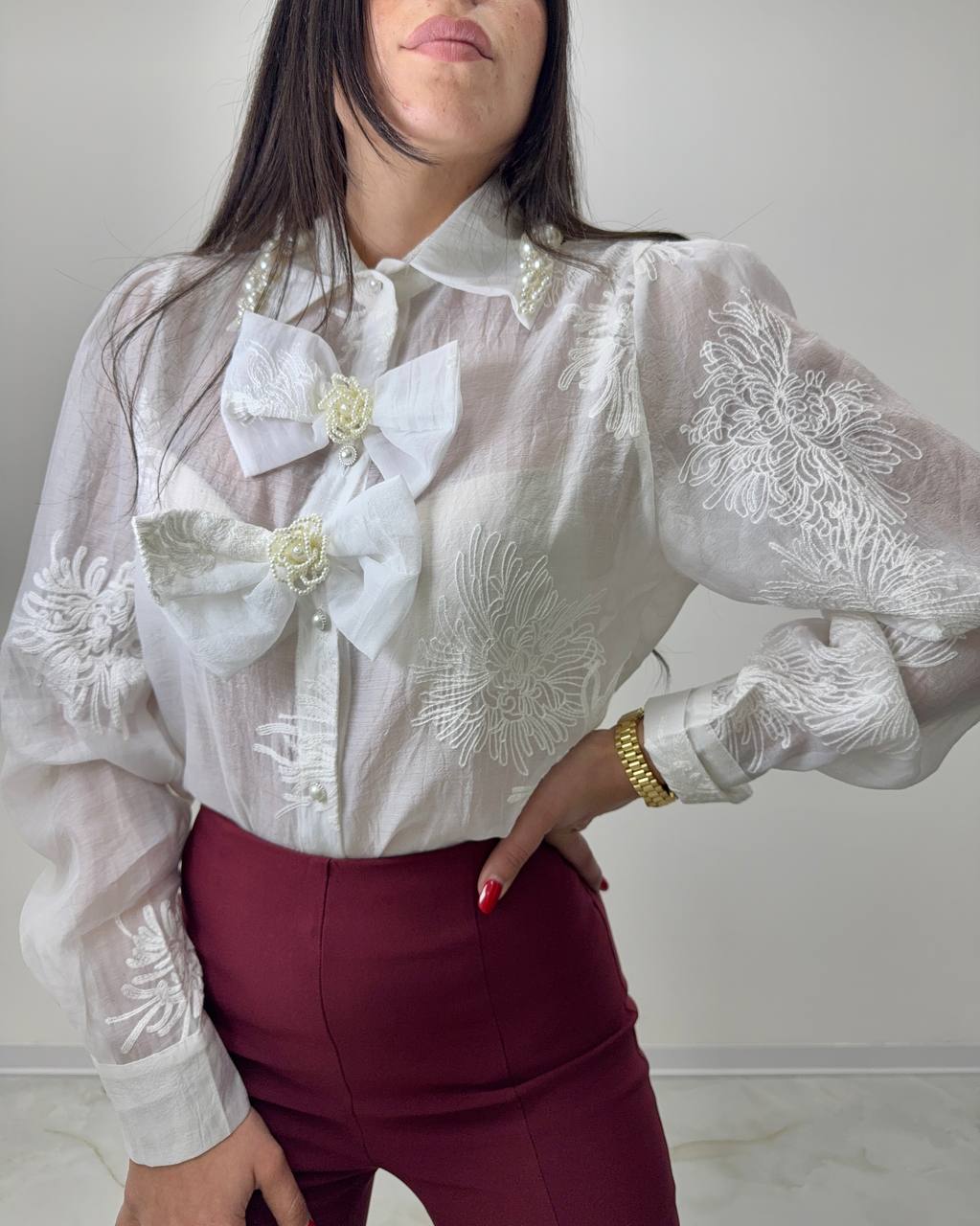 Camicia Flower TAGLIA UNICA. Camicia con applicazione di spilla a fiore, nodo sula vita. VESTIBILITA':...