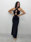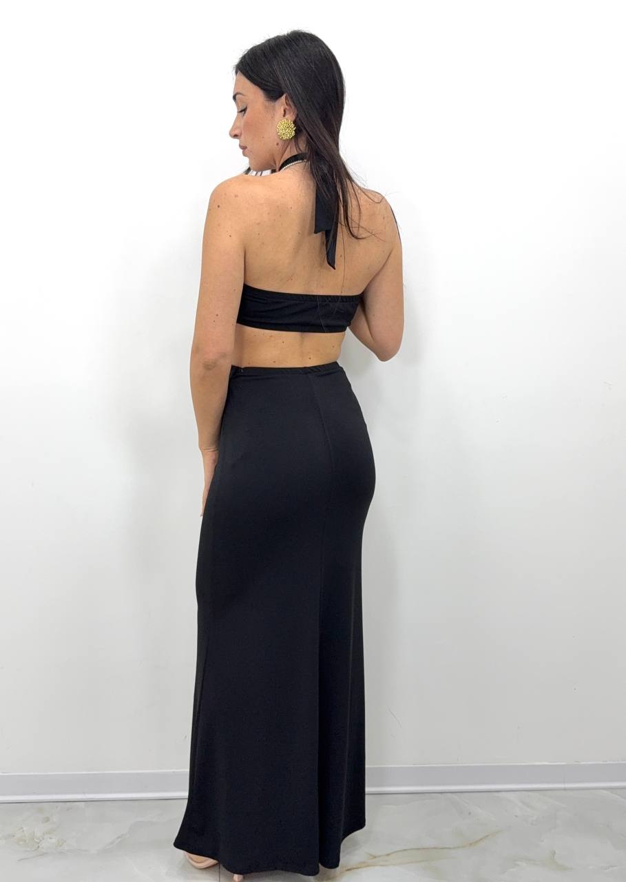 Abito con scollo particolare, allacciatura sul collo.Scollato anche sul retro.