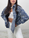 Camicia in jeans con fiori ricamati di colore bianco in rilievo.
