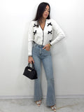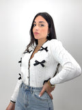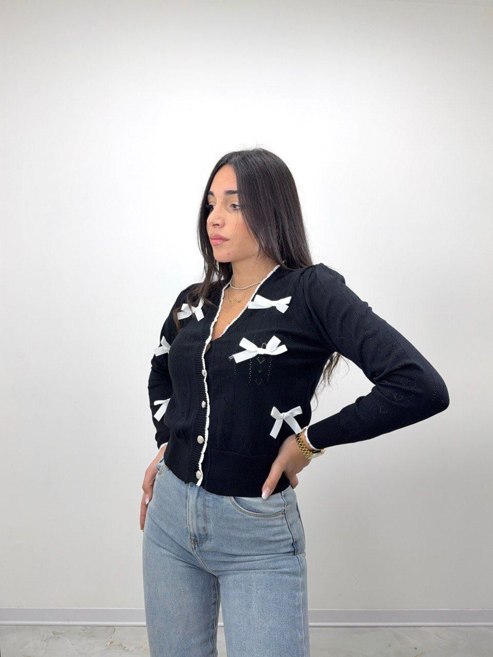 Cardigan manica lunga con applicazioni fiocchi, bottoni argento.