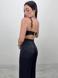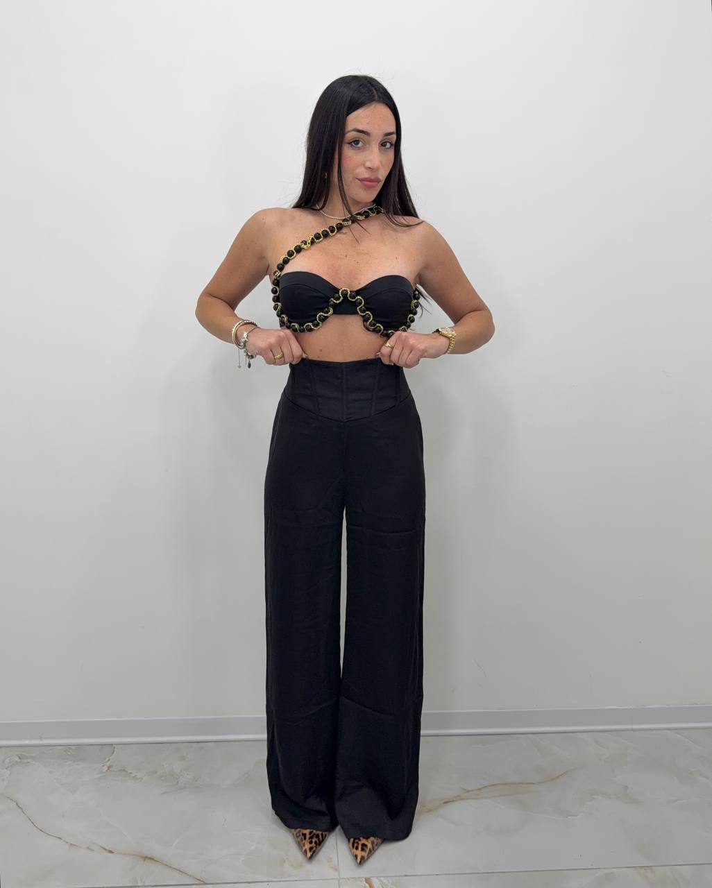 Coordinato composto da top con applicazioni in oro, coppetta preformata. Pantalone a palazzo con fantasia di piccolo bustino, chiusura con zip sul retro.