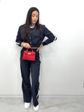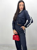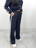 Coordinato composto da jacket chiusura centrale con bottoni a ciappa, due tasche a toppa con pattina, aggiunta di elastico sul collo sui polsi e in vita, striscia bianca sulle maniche. Pantalone palazzo, chiusura centrale con bottone, aggiunta di elastico sul retro, due tasche anteriori e due posteriori. Striscia ai lati della gamba.