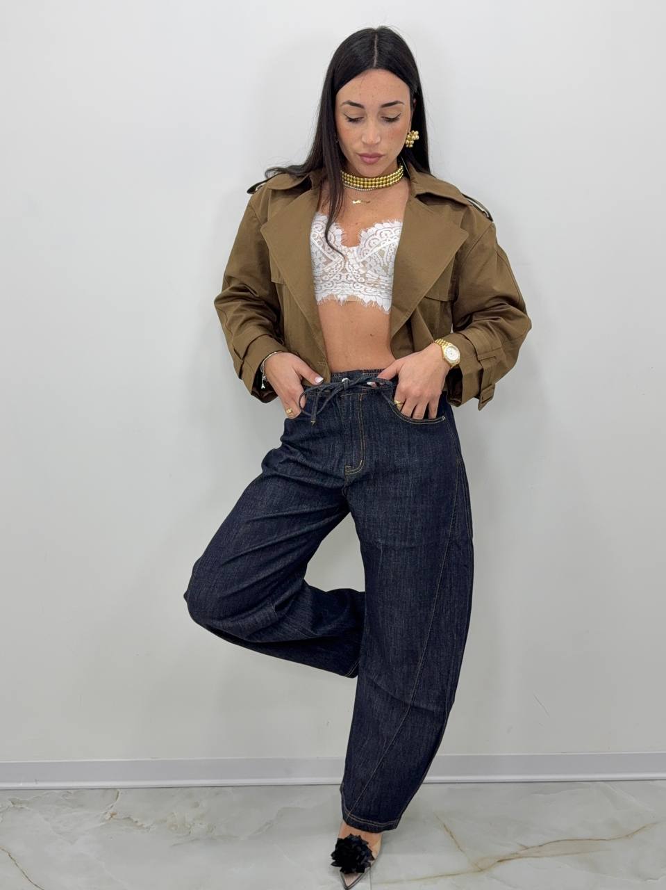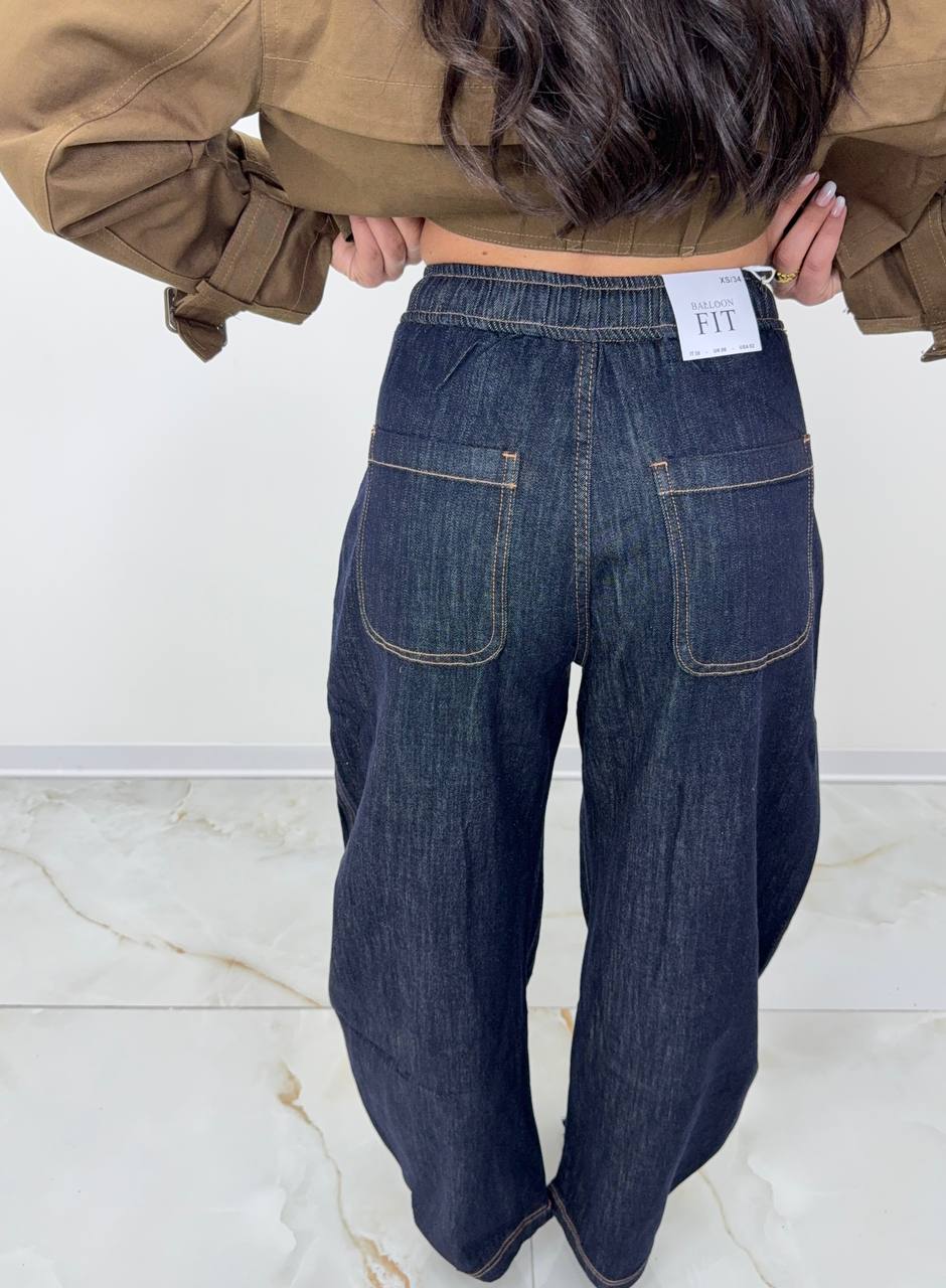 Jeans modello balloon lunghezza alla caviglia, con elastico in vita e laccetto per garantire una vestibilità più comoda.