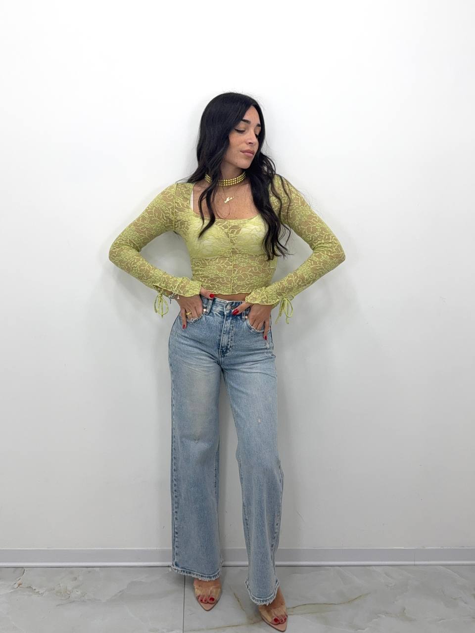 La ragazza in foto è alta 1,70 pesa 60 Kg ed indossa la Tg XS.