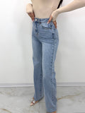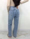 Jeans Aurora a palazzo lavaggio chiaro, taglio vivo sul fondo.