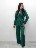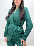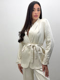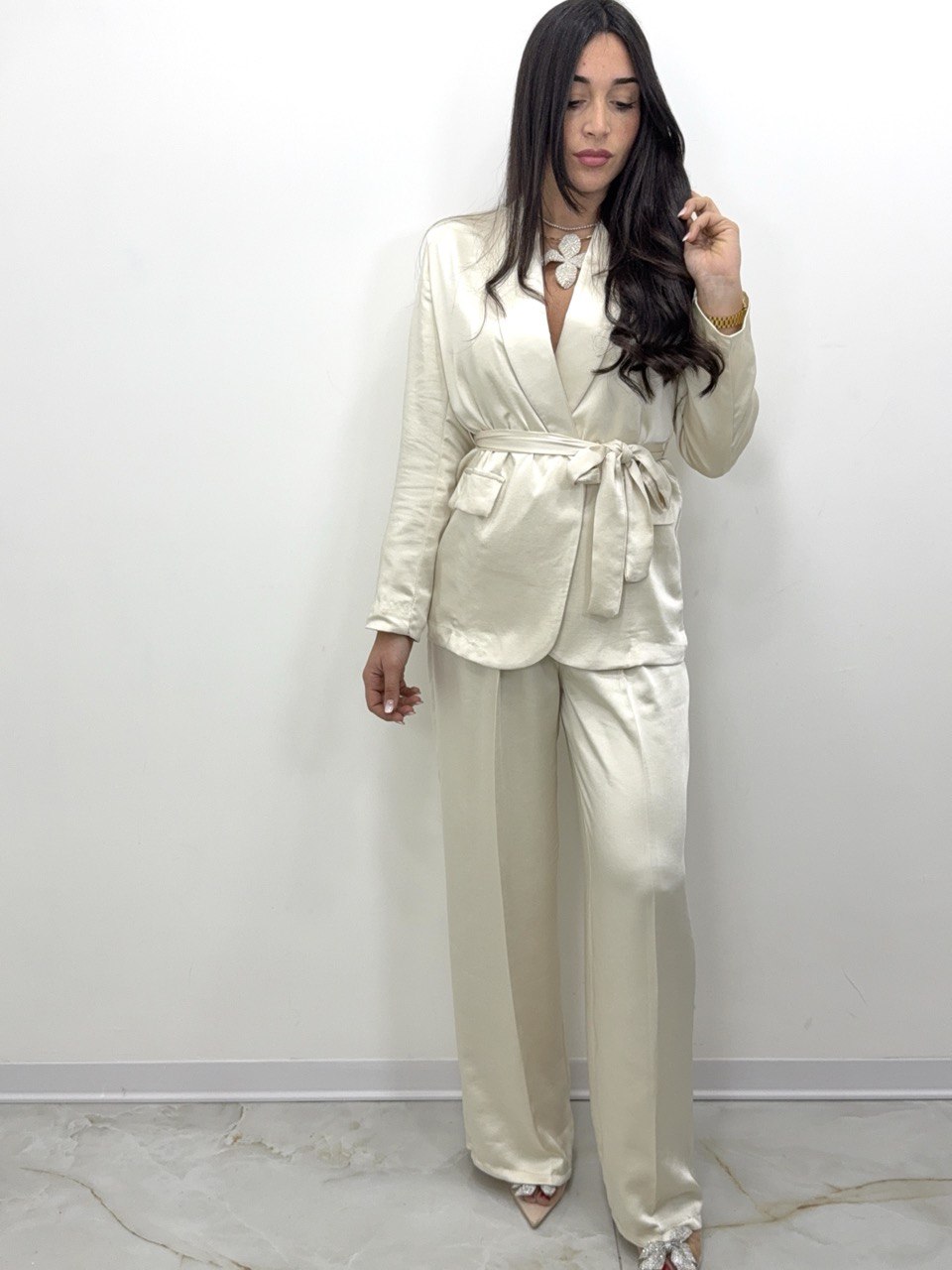 Tailleur Giacca chiusura con fusciacca, pantalone chiusura con zip e bottone, aggiusta di elastico sul retro.