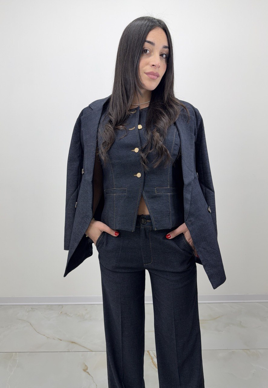 Tailleur Sally 3 pezzi composto da Blazer, gilet e pantalone, effetto jeans.