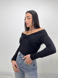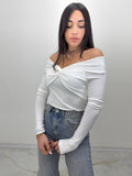 Top con scollo a barca con particolarità di nodo sul decolltè.