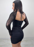 Vestitino total black particolarità di perline sulle maniche, coppetta preformata. Arricciatura posteriore.